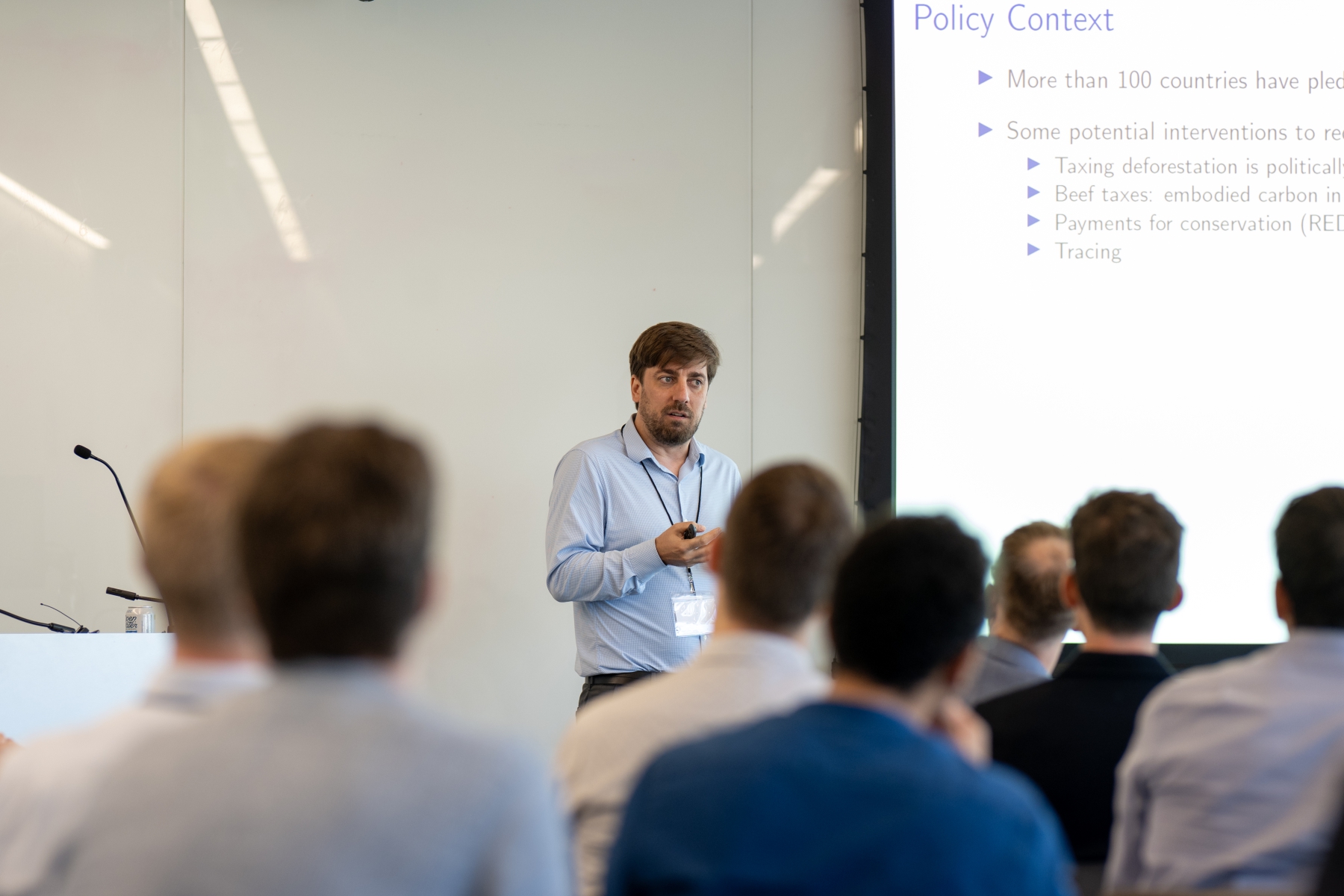Pol Antràs (Harvard) presents during a session on global value chains and trade in tasks.