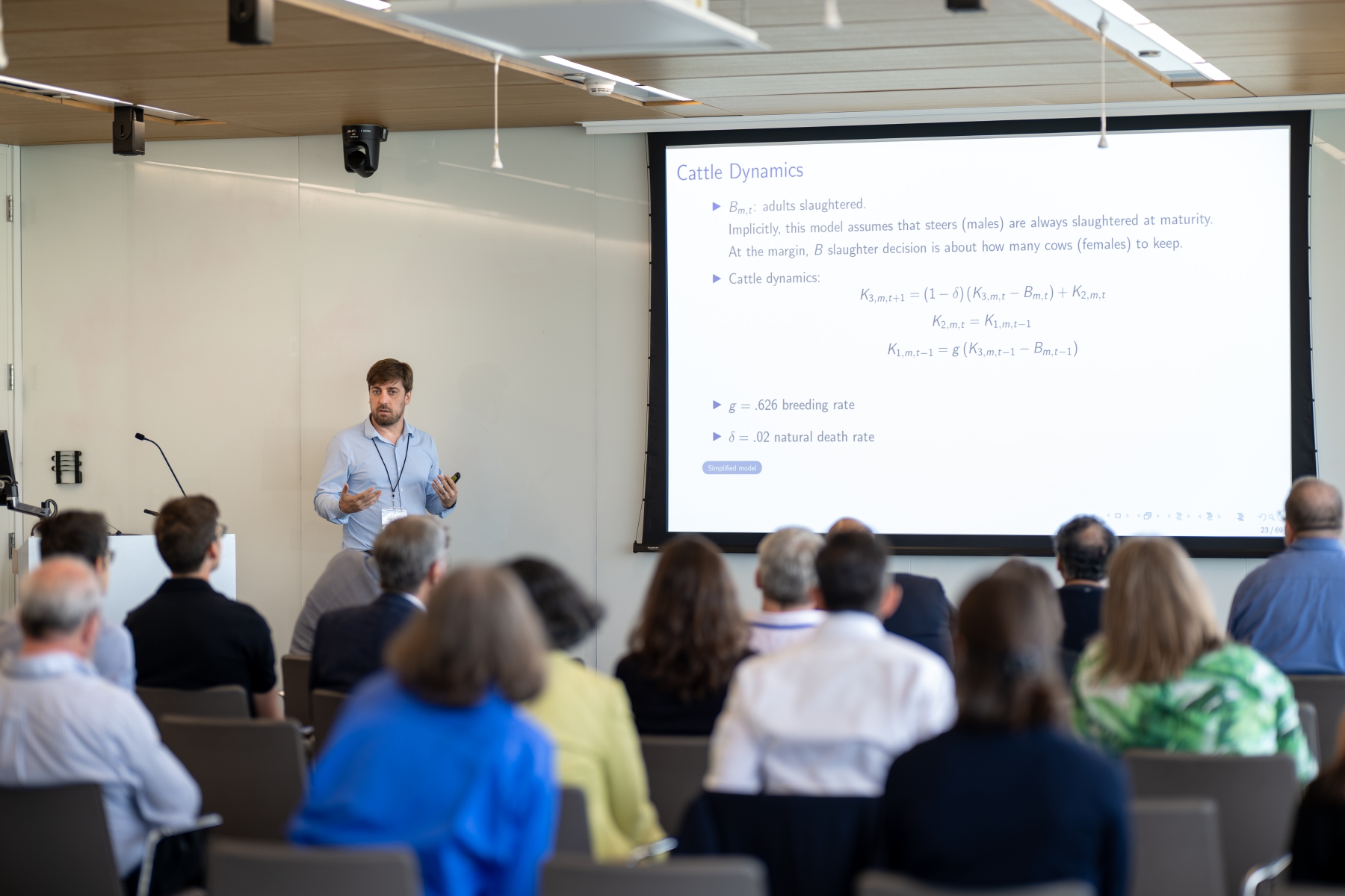Pol Antràs (Harvard) presents during a session on global value chains and trade in tasks.