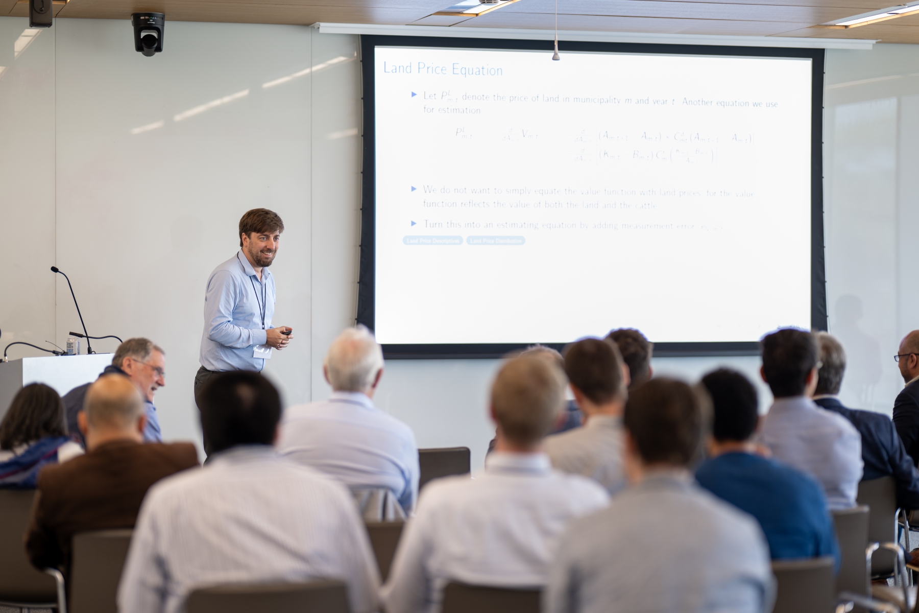 Pol Antràs (Harvard) presents during a session on global value chains and trade in tasks.
