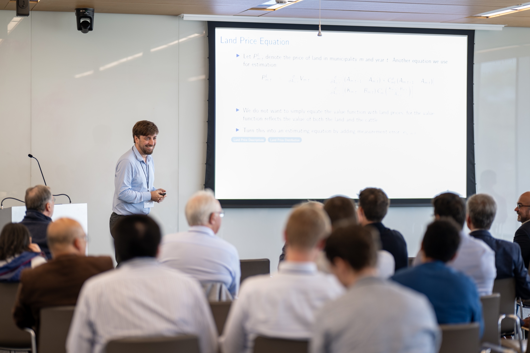 Pol Antràs (Harvard) presents during a session on global value chains and trade in tasks.
